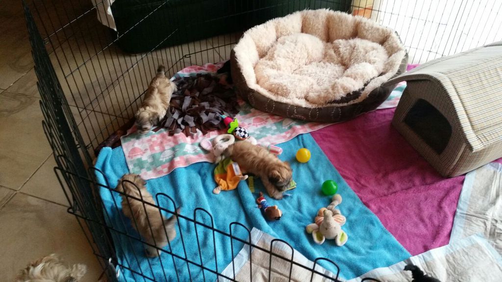 Die kleinen Sonntagsfellnasen sind nun 6 Woche jung und alle haben ihre neue Familie bereits gefunden. Ihr Gewicht haben sie auf 950 - 1180 Gramm gebracht. Damit liegen sie in ihrer Entwicklung genau richtig. Sie haben ihre Augen und Ohren geöffnet und es brechen die Milchzähne durch. Es wird miteinander gespielt und auch Dexter unser kleiner Rüde beginnt ihnen alles mögliche, natürlich auch Schabernack, bei zu bringen. Dazu sind die kleinen Rangen in ihren großen Stubenauslauf umgezogen.